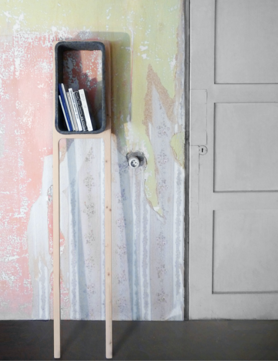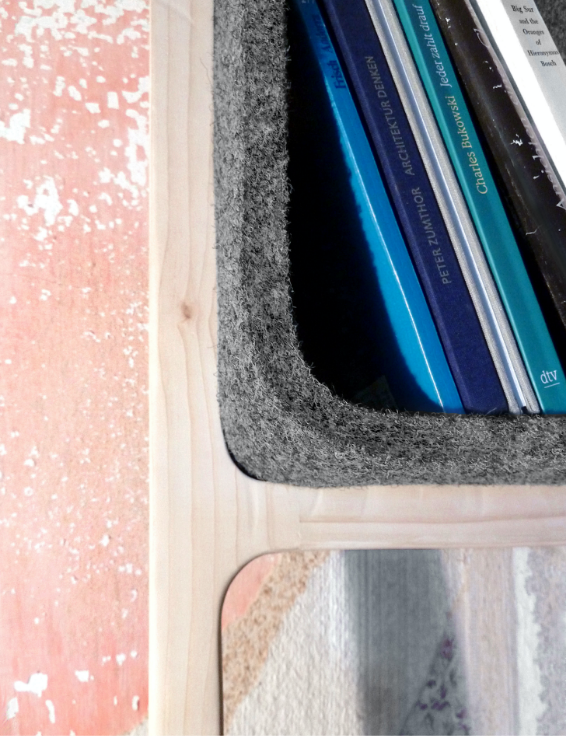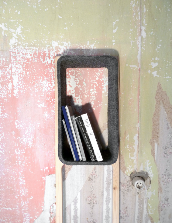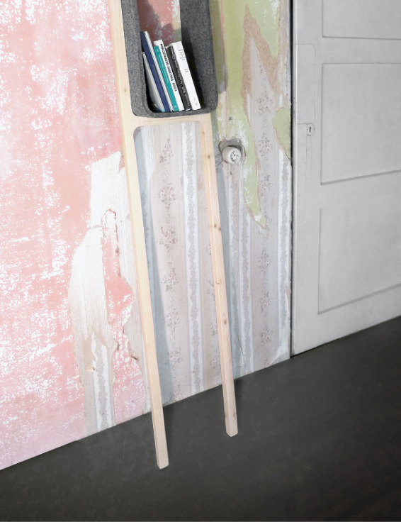 Lazy shelf is a simple leaning shelf composed of an old piece of sprucebar and a leftover of a needlefelt carpet.